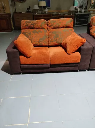 Se vende conjunto de dos sofás,se retapizaron todo lo marrón oscuro del sofá ya que eran de polipiel blanca y se estropeó y los asientos sean cuidado mucho nada de esculados están como nuevos,uno de dos plazas y otro de tres plazas ,soporte de los sofás diseño moderno Están todos las fundas lavadas respaldo asientos cojines, los asientos estos son extensibles a mano ,respaldo requinables un poco en el cabezal - Tapicería de tela. - Diseño moderno con cojines. - Base y estructura en tono marrón oscuro. - Cojines y asientos en color naranja con estampado.