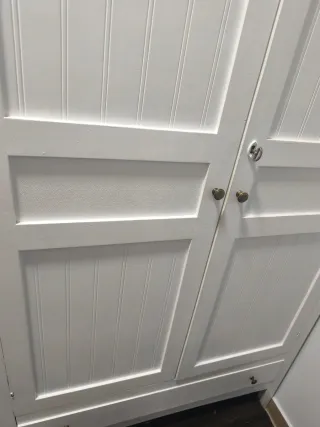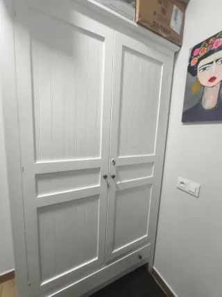 Armario de madera de estilo clásico con puertas batientes. - Diseño con paneles verticales. - Tiradores metálicos. - Cajón inferior. Cama sinfonier a juego con mesita Lote completo 250. Urge su venta.