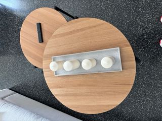 Conjunto de dos mesitas auxiliares con un diseño moderno y funcional. - Tableros de madera con acabado natural. - Patas de metal negro. - Formas orgánicas que encajan en cualquier espacio.