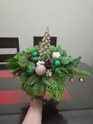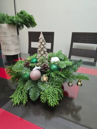 Precioso centro de mesa decorativo para la temporada navideña. Añade un toque festivo a tu hogar. - Adornado con esferas,bolas,flor de algodón y piñas. - Incluye un árbol decorativo o una vela o otro objeto decorativo. - Elementos naturales y brillantes.