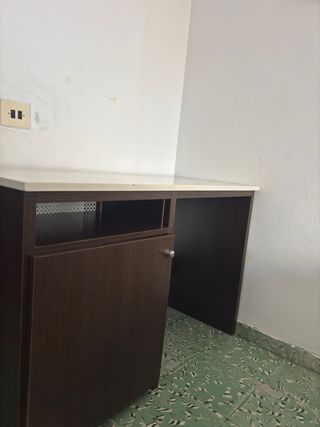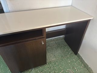 Es una escritorio de madera oscura y la parte superior blanca está en muy buen estado.