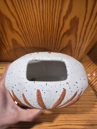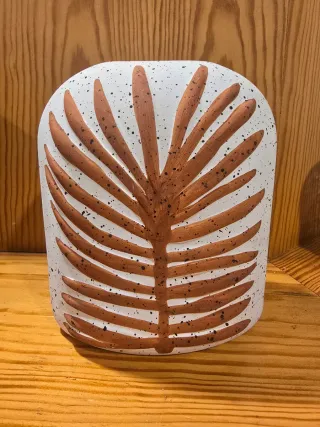 Este florero de cerámica presenta un diseño único con un patrón de hoja en relieve. - Acabado blanco moteado con detalles en color terracota. - Forma redondeada y moderna.