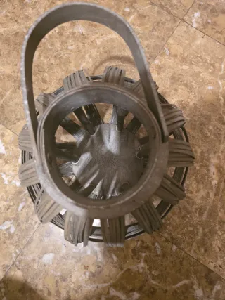 Candelabro decorativo con un diseño rústico y elegante. - Estructura de mimbre y madera. - Tonos marrones y grises. - Asa para facilitar su transporte.