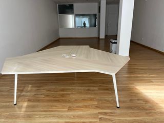 Mesa de oficina triangular de diseño moderno. - Tablero con acabado en madera y detalles en espiga. - Patas metálicas blancas.