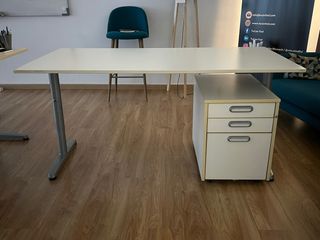 Conjunto de mesa de oficina con cajonera a juego. Diseño moderno y funcional. - Mesa de superficie amplia. - Cajonera con tres compartimentos. - Patas metálicas resistentes.