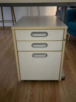 Mesa con una práctica cajonera. - Cajonera con tres cajones. - Estructura de madera y metal. - Tiradores de plástico.