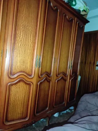 Armario de madera con un diseño clásico y elegante. - Puertas con detalles tallados y acabado brillante. - Tiradores metálicos ornamentados.