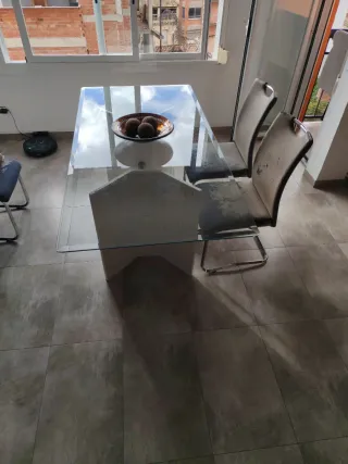 Elegante mesa de comedor con sobre de cristal y base es de piedra blanca - Diseño moderno y minimalista. - Combina a la perfección con cualquier estilo de decoración. - Patas metálicas resistentes. De largo 180cm Ancho 90 Se regala cuatro sillas en buen estado hace falta tapizarlas