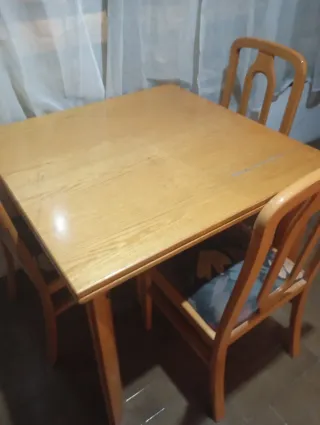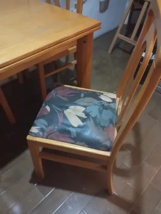 Mesa de comedor con opción de llevarte 6 sillas de madera y tela. Desgastados por el uso pero su estado es aceptable. No hago envíos. - Mesa de madera. 25€ - Sillas de madera y tela. 3€ cada una. Sí vienes a recogerlo antes del domingo 15 REGALO las 6 sillas.