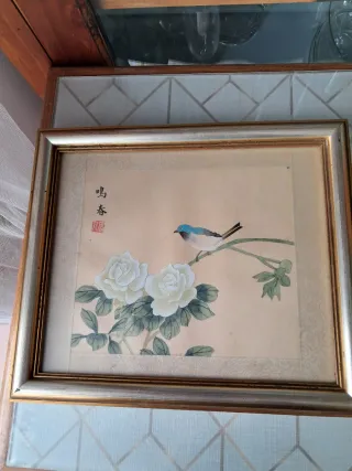 Preciosos cuadros pintados a mano sobre seda, con un diseño de pájaro y flores. - Marco de madera con detalles dorados. - Motivo oriental con caligrafía. - Ideal para decoración de interiores.