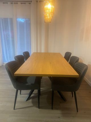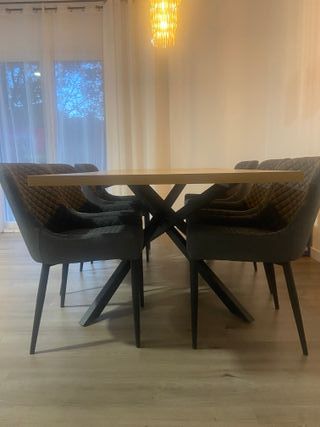 Conjunto de mesa de comedor con seis sillas tapizadas. Poco uso, solo 5 meses. - Mesa con sobre de madera. - Sillas con estructura metálica y tapicería de tela. - Diseño moderno y elegante.