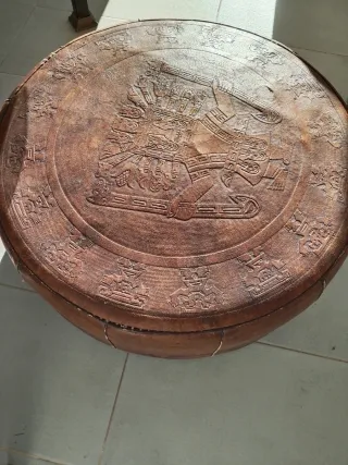 Puff redondo con un intrincado diseño azteca grabado en la superficie. - Grabado detallado de figura central y motivos circundantes. - Acabado rústico y artesanal. -Medidas 72 de acho y 25 de alto