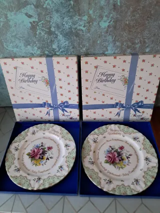 Set de dos platos de porcelana Royal Albert con diseño Happy Birthday. - Cada plato presenta un ramo de flores en el centro. - El borde está decorado con un patrón festoneado en verde. - Incluyen mensajes de felicitación en varios idiomas alrededor del borde.