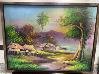 Preciosa pintura al óleo sobre lienzo. Tamaño 1,20x73 cm. - Representación de un paisaje rural con casas. - Tonos verdes y dorados predominantes. - Marco dorado ornamentado.