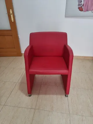 Conjunto de sillas individuales en un vibrante color rojo. Su diseño moderno las hace perfectas para cualquier espacio. 15€ cada una. - Tapicería de piel. - Patas metálicas plateadas.