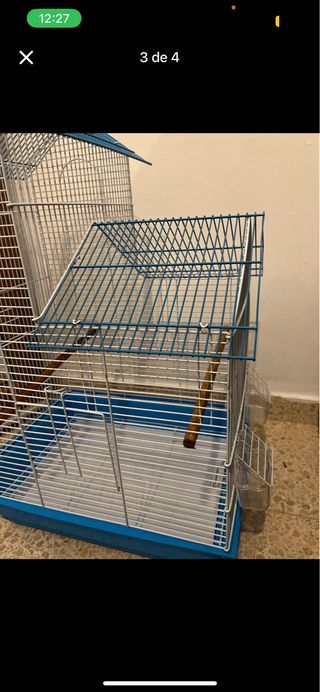 Jaula para pájaros con diseño espacioso y seguro. - Bandeja extraíble para facilitar la limpieza. - Incluye dos perchas de madera. - Techo a dos aguas con detalles decorativos. A recoger en PALMA