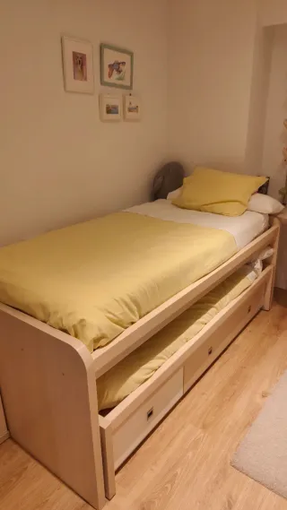 Cama nido funcional con espacio de almacenamiento integrado. Su diseño moderno combina a la perfección con cualquier habitación. - Para colchones de 105 - Dos cajones inferiores. - Tiradores de diseño. Medidas: 200x115x80cm (Largo x Ancho x Fondo) IMPORTANTE: La cama se encuentra en Los Alcázares (Murcia)