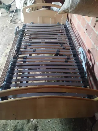 Estructura de cama hospitalaria con somier de láminas. SIN ESTRENAR el enfermo no llegó a utilizarla - Marco principal de madera. - Base de láminas de madera y soportes de plástico. - Laterales de metal. Totalmente NUEVA SIN ESTRENAR Precio nuevo 1400