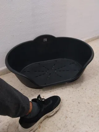 Cama para perro de plástico resistente. Su diseño ovalado y bordes elevados ofrecen un espacio acogedor. - Material: Plástico. - Color: Negro. - Diseño: Ovalado con bordes elevados.