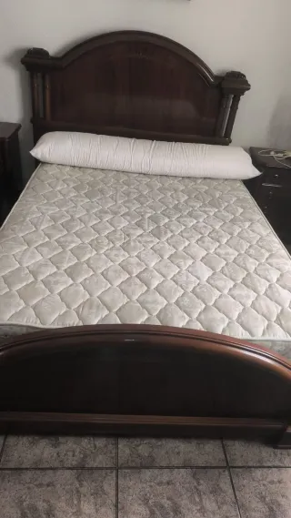 Estructura de cama de matrimonio con un diseño clásico y elegante. - Cabecero de madera con detalles tallados. - Acabado en tono madera natural. Colchon de espuma de ikea. Estructura metalica de lamas de madera. Cabeceros y mesillas de noche incluidos. Situado en Playa Virginia, El Palo, Malaga. Se está vaciando un piso entero y hay más muebles disponibles. Transporte no incluido, ubicado en un edificio con ascensor.