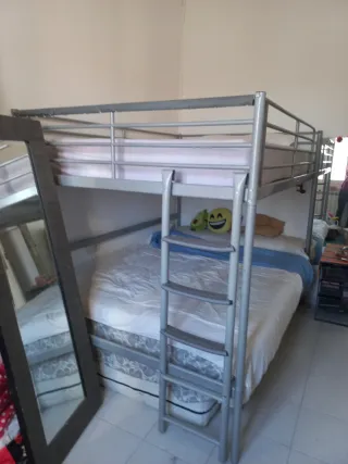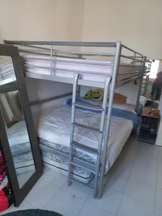 Cama alta de matrimonio con estructura metálica. - Diseño moderno y funcional. - Ideal para optimizar el espacio. - Colchón de 135 cm. !!! QUIEN SE LA QUEDE LA TIENE QUE DESMONTAR!!!Vienda a pie de calle.