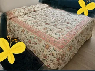 Edredón para cama de matrimonio 1.50 cm hecho encargo. Tela de alta calidad algodon satén firma" la Casa de Sati " con un bonito estampado floral colores primaverales y muy combinables, terminación de esquinas con enganches para que quede más ajustado. Relleno de poliester por lo que se lava en lavadora y valido para temperaturas otoño invierno. Regalo dos cojines de la misma tela de 60/60 cm acabados en volante. - Diseño con flores en tonos rosas y verdes. - Acabado acolchado.