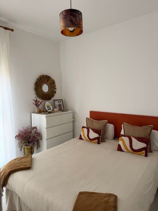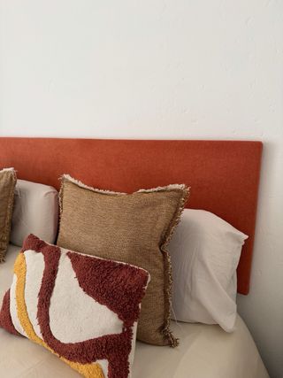 Cabecero de cama en un llamativo color naranja coral. Añade un toque de color a tu dormitorio. - Tapizado en tela.