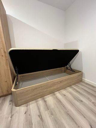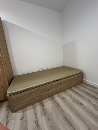 Cama individual con canapé integrada, ideal para espacios pequeños. Se encuentra en muy buen estado. - Incluye canapé abatible para almacenamiento. - Perfecta para una habitación individual. - No incluye colchón. - Se vende montado.