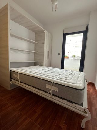 Cama abatible vertical, ideal para espacios reducidos.. - Estructura de metal y madera. - Fácil de plegar y desplegar. Se fabrica en todas las medidas posibles de nuestra técnico y se pueden hacer medidas especiales. Podemos elegir dos fondos, 34,5cm y 45cm con dos estantes interiores. Este modelo lleva somier de lamas, pistón hidráulico, salva rodapié y patas manuales. Este modelo no necesita cinchas para sujetar el colchón.