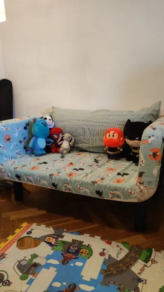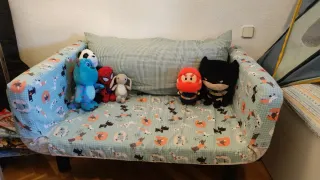 Sofá cama abatible con un diseño alegre y juvenil. Los brazos del sofá se pueden bajar para convertirlo en cama, aunque uno de los brazos está estropeado el tope, por lo que recomiendo no bajarlo. - Tapizeria gris de flores, tiene unas fundas de perros incluidas. - Estructura de metal. - Mecanismo click-clack para convertirlo en cama.