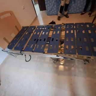 Cama ortopédica con somier de láminas y estructura de madera. - Somier de láminas azules. - Estructura de madera en cabecero y piecero. - Base metálica resistente. - Mando a distancia - Colchón antiescaras