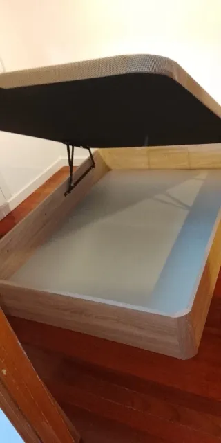 Canapé abatible de 90x200 con estructura de madera y tapa tapizada. - Amplio espacio de almacenamiento interior con 29cm de altura. - Estructura de tablero de 3cm. - Mecanismo de elevación lateral. - Diseño moderno y funcional. - Acabado imitación a cerezo Se ha usado menos de un año, esta nuevo. No se hacen envíos.