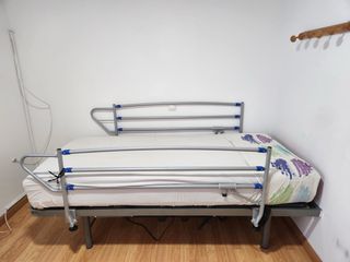 Solo tiene 6 meses de uso . Ha costado 912€ Tal como se ve en las fotos como nuevo todo Cama articulada para geriatría y ortopedia. Tiene ruedas .Cuenta con barandillas de seguridad y un mando para ajustar la posición. - Estructura principal de metal. - Cabecero y piecero de madera. - Colchón de color azul viscoelastico Cama articulada eléctrica de cuatro planos con carro elevador. Medidas 90x 190cm. Colchón viscoelástico 11+3 cm, cabecero piecero y barandillas. - Estructura fuerte en acero, con carro elevador, sistema tijera. - Bastidor somier de 50x20x1.5 mm. - Planos articulados de 30x20x1.5 mm. Somier con lamas