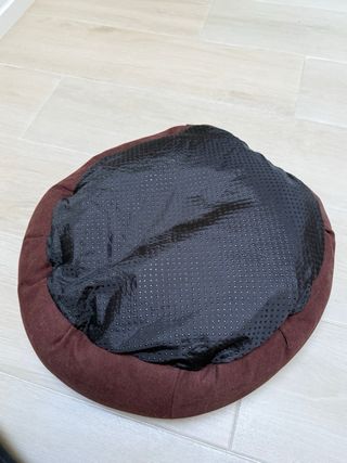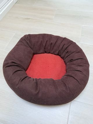Cama redonda y acolchada para mascotas. - Exterior de tela marrón. - Interior de tela roja. Diámetro exterior 44 cm Diámetro interior 30 cm