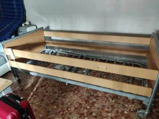 Cama articulada con estructura metálica y superficie de madera. - Base de cama con colchón. - Ruedas para facilitar el desplazamiento. - Mecanismo de articulación.