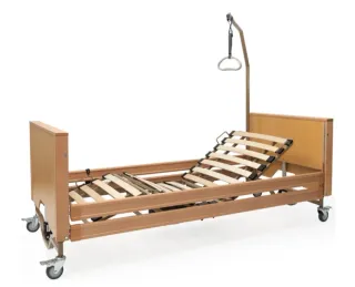 Cama articulada con estructura metálica y somier de láminas de madera. - Base de cama con 5 planos de articulación. - Motor eléctrico para ajuste de posición. - Cabecero y piecero de madera. - Ruedas para facilitar el desplazamiento.