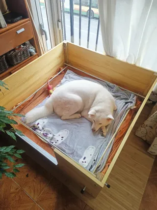 Cajón paridera de madera de pino. 115x115x40cms. Con barras antiaplastamiento, puerta y bebedero acoplable. Fabricada por un experto. Solo ha sido usada por una camada nacida en diciembre 2025. Para perros de raza grande. Proporciona un espacio seguro y cómodo desde el nacimiento hasta el destete. Precio Paridera: 90 euros. Ofrezco también una jaula/corral plegable, útil cuando cumplan el mes y medio. La jaula es más vieja y tiene algo de oxido. Pero se usó sin problema el pasado mes, que una vez que cumplen esa edad, están que se salen (de la paridera). Precio corral plegable: 20 euros No pagues novatadas y cría con seguridad.