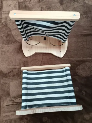 Conjunto de dos hamacas para gatos, elaboradas con una base de madera y tela a rayas. - Base de madera con diseño. - Tela con estampado de rayas.