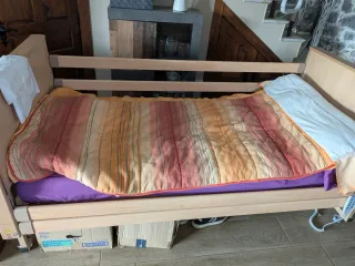 Cama de madera con somier articulado. - Estructura de madera clara. - Colchón anti escaras con su funda incluida . Barreras a ambos lados,la cama tiene varias posiciones de altura y para estar tumbada y sentada. Esta desmontada y embalada en sus cajas Con batería y colchón debidamente protegidos.