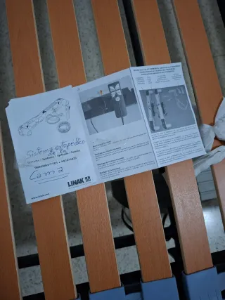 Cama ortopédica con somier de láminas de madera y estructura metálica. - Somier articulado. - Base de láminas de madera. - Estructura metálica resistente. - Mando para ajuste de posiciones. Comprada en marzo 2025