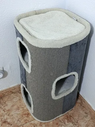 Conjunto de cama y rascador para gatos, ideal para que tu mascota juegue y descanse. - Múltiples niveles para trepar y descansar. - Superficie de rascado para mantener las uñas saludables. - Cama superior acolchada para mayor comodidad.ahy que cambiar la cuerda de rascar