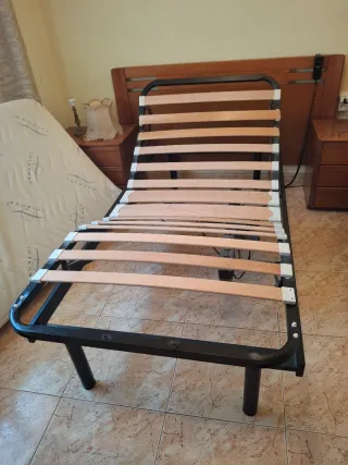 Se vende base de cama articulada eléctrica de 105x190 cm, con barras protectoras laterales y colchon. Se encuentra en buen estado. - Estructura metálica. - Láminas de madera. - Color marrón y rojo.