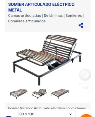 Somier articulado con motor (estilo hospital) en muy buen estado. Características: Se vende somier articulado con motor (estilo hospital) en muy buen estado de uso. El motor funciona sin ruidos extraños y el mando responde correctamente. La estructura metálica está firme y las láminas de madera se conservan en perfecto estado. Características: 1. Medidas de somier: 90X190cm 2. Motor eléctrico silencioso 3. Mando con cable: cinco posiciones 4. Estructura metálica resistente Es una buena opción para mejorar la calidad de vida y la comodidad de personas con movilidad reducida. Se vende con factura para seguridad.