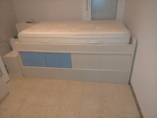 Cama con base de almacenamiento y cajones. 140 X 200 - Estructura de madera. - Cajones blancos. - mesita de noche blanca Ikea incluida El colchón no se incluye porque ya tiene mucho uso
