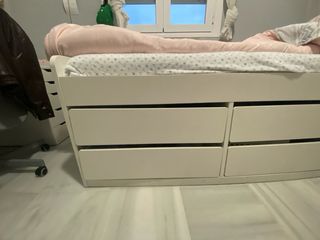 Cama IKEA con 3 cajones grandes de almacenaje. Estructura en blanco y madera pino, usada pero en muy buen estado. - Estructura principal en color blanco. - 3 cajones frontales grandes en acabado de madera de pino. - Incluye colchón cómodo (siempre usado con funda). - Diseño funcional y espacioso. - Perfecta para habitación juvenil, extra o apartamento. Se puede ver y probar sin compromiso. Se puede vender por separado. Preguntar. Imperfectos mayores en las últimas dos fotos, pero se pueden pintar.