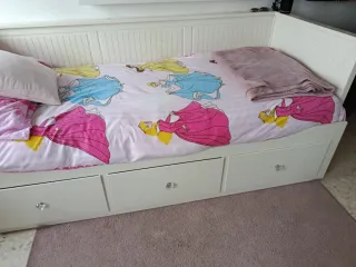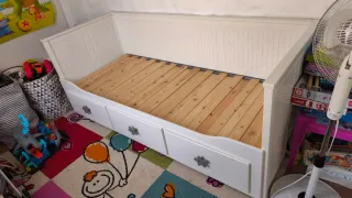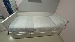 Diván modelo Hemnes de Ikea, con un diseño clásico y funcional. - Tres cajones integrados para almacenamiento. - Estructura de madera robusta. - Acabado en color blanco. - Con un colchón. - Está desmontada casi entera.