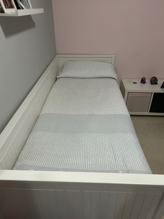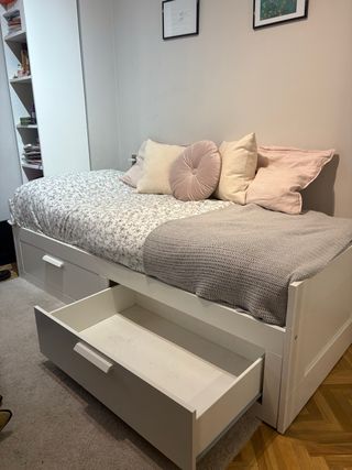 Vendo cama extensible IKEA BRIMNES blanca con dos cajones de gran capacidad. Tiene uso normal y está en buen estado, se extiende/recoge correctamente y los cajones funcionan sin problema. La vendo por cambio de mobiliario. Se entrega en mano y desmontada, lista para transportar. Colchones no incluidos, si te interesa añadirlos, consúltame. Medidas (según ficha): * Cama cerrada: 86 x 205 x 57 CM * Cama extendida: 160 x 205 CM *Cajones (interior): 87 x 53 x 21 CM. Peso máx 20kg por cajón. * Colchón compatible: 80 x 200 CM Cualquier duda, escríbeme sin problema.