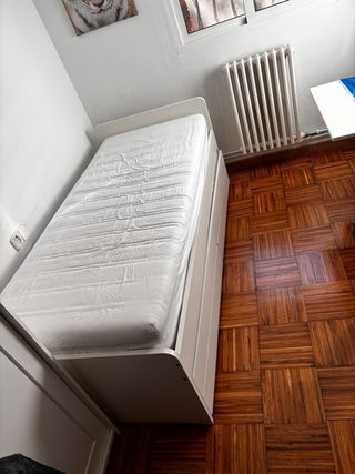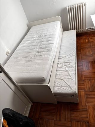 Cama nido extensible Flekke de Ikea, ideal para aprovechar el espacio. Se encuentra en muy buen estado, solo le falta una parte del colchón supletorio (se puede poner un cojín) - Estructura de color blanco. - Incluye dos colchones. - Cajones de almacenaje integrados. El respaldo se puede montar a ambos lados. Con unos cuantos cojines mullidos a modo de respaldo puedes transformar este diván en un cómodo sofá. El sofá se puede transformar rápidamente en una cama individual para así aprovechar al máximo el espacio de suelo. Tira del somier hacia afuera y obtendrás rápida y fácilmente una cómoda cama doble. Los cajones son grandes.