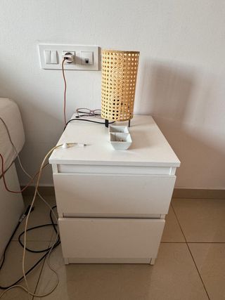 Se vende conjunto de cama Askvoll de Ikea, incluye mesita de noche y lámpara. - Estructura de cama blanca. - Mesita de noche con dos cajones. - Lámpara de mesa con pantalla de bambú.