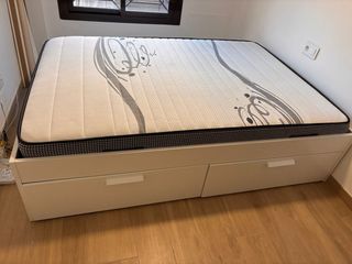 Estructura de cama Brimnes de Ikea, color blanco, tamaño 160x200 cm. 4 cajones grandes con mucho espacio para almacenar. Incluye somier. Y colchón Emma con su funda original. 3 años de uso. Está como nuevo - Diseño moderno y funcional. - Base de cama con almacenamiento.